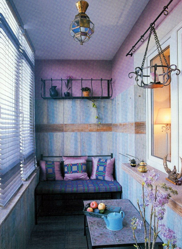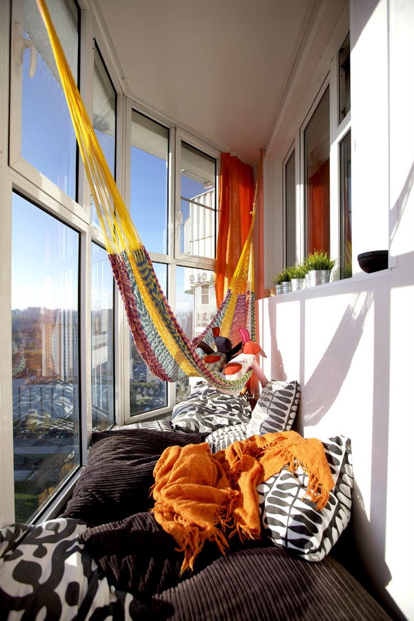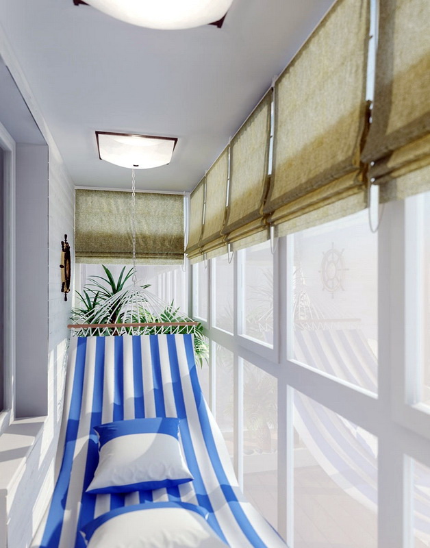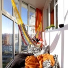 - Verglaste Balkon ist ein großartiger Ort zum Entspannen. Eine gemütliche Hängematte, weiche Kissen passen perfekt in eine enge Loggia mit wenig Platz. Wenn der Balkon klein ist, ist dieses Innendesign die beste Option.