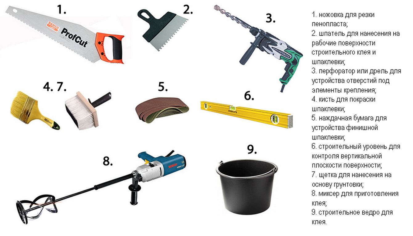 Sie werden auch ein Rahmengerät benötigen. In diesem Fall benötigen Sie Holzbalken sowie Nägel, um sie zu sichern. Sie benötigen möglicherweise und spezielle Befestigungen - Nägel mit sehr breiten Kappen. Sie werden verwendet, wenn Polystyrol nicht mit Klebstoff fixiert ist.