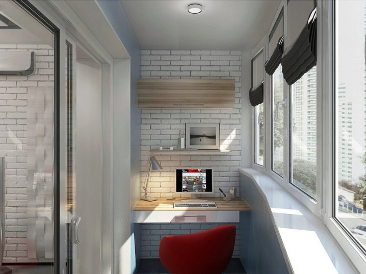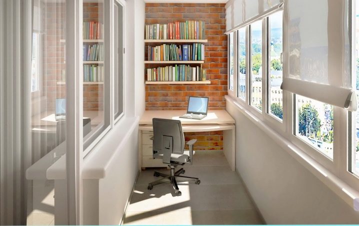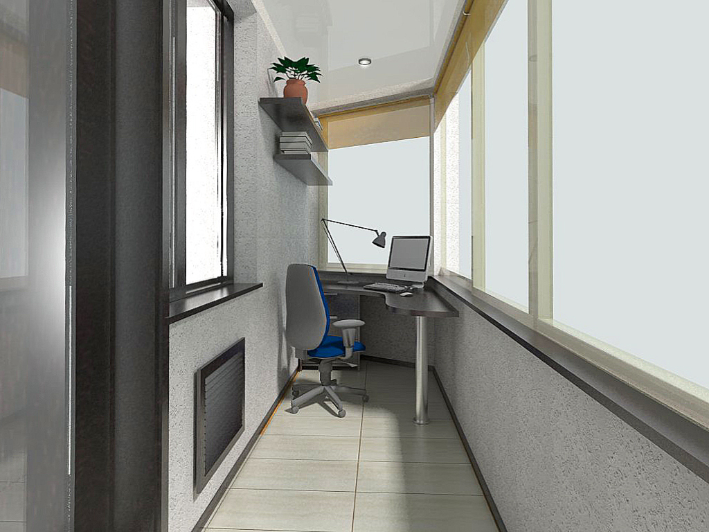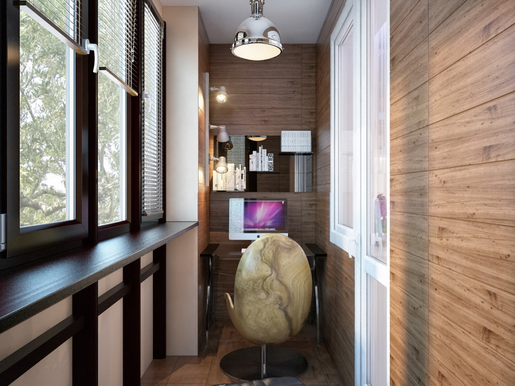 - Eine interessante Möglichkeit, eine Loggia einzurichten, ist ein persönliches Minibüro. Eine großartige Idee für diejenigen, die in Frieden und Einsamkeit arbeiten möchten. Es ist notwendig, einen Tisch mit einem Stuhl zu stellen, ein Regal für Bücher oder Dokumente zu stellen und alles, persönlicher Raum ist bereit.