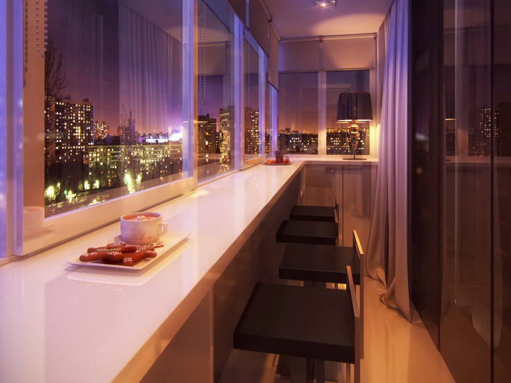 Anordnung von Möbeln und Beleuchtung. Wenn es sich bei der Loggia um ein Wohnzimmer handelt, müssen Sie es mit Hilfe von Möbelplatzierung und dem Aufstellen von Beleuchtungsgeräten gemütlich machen.
