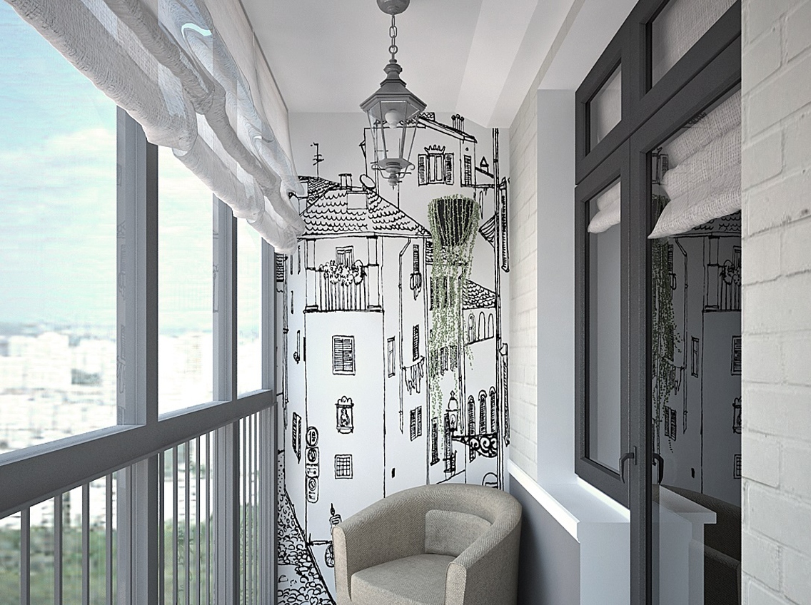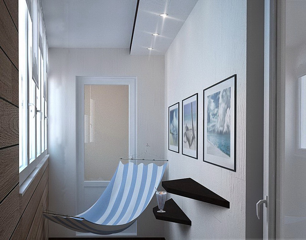 - Oft wird der Balkon als gemütlicher Ort zum Wohlfühlen genutzt. Hier können Sie Musik hören, ein Buch lesen, Kaffee trinken oder all diese Aktionen kombinieren.Für einen solchen Innenraum eignet sich gut Schaukelstuhl, Miniaturtisch, bequeme Sitzpoufs oder ein Sofa. Sie können den Innenraum mit Vorhängen, Farben oder Gemälden verdünnen.