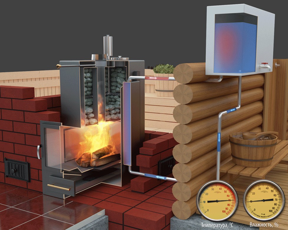 Ein hochwertiger Kaminofen sollte die Luft unter der Decke auf 80 Grad erhitzen können, damit Sie dort bequem dampfen können. Kamenka werden durch Ausführung offen oder geschlossen gemacht.