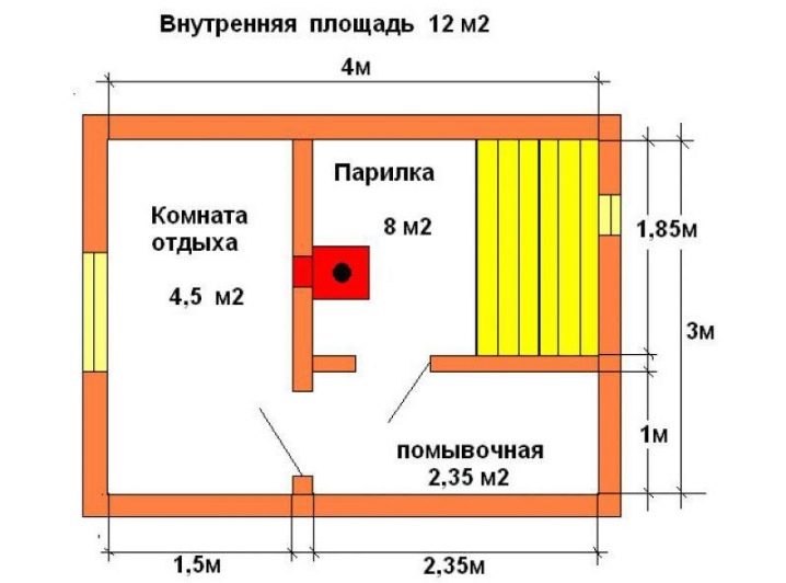 Es sollte berücksichtigt werden, dass selbst die besten Bäder aus Lehmzement-Betonblöcken hinsichtlich des Wärmeschutzes den Holzkonstruktionen unterlegen sind. Das getrocknete Kiefernholz überträgt doppelt so viel Wärme wie der isolierende Blähtonbeton, und wenn die Konstruktion mit rahmenloser Technologie ausgeführt wird, wird der Unterschied fünffach. Das spezifische Gewicht des Materials beträgt ungefähr 1000 kg pro 1 cu. m. Genauere Parameter für das endgültige Design finden Sie in der Dokumentation des Herstellers. Relativ kompakte Badfläche von 9 Quadratmetern. m in einer Etage gebaut und ist in der Regel in drei Abschnitte unterteilt: