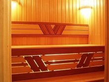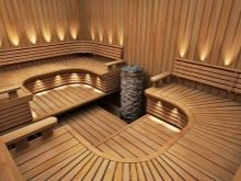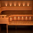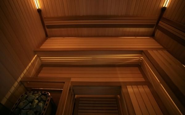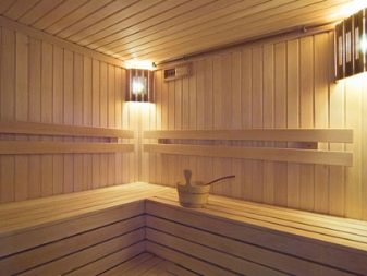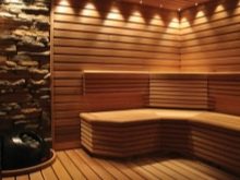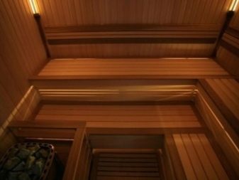 Wenn Sie keine LED-Streifen in der Sauna installieren müssen, können Sie sich an den Strahlern wenden und sie um den Raum herum installieren - direkt über den Sitzen. So können Sie sich auf die ordentlich gefertigten Bänke konzentrieren und das Dampfbad etwas leichter machen.