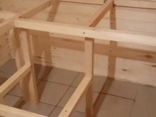 Für die Herstellung von Rahmengestellen empfehlen Experten den Kauf eines 50x70 cm Holzes.. Damit das Holz nicht austrocknet, sollte außerdem die Dicke der Platte etwa 4 mal kleiner als die Breite sein. Der Rahmen sollte weiter gestärkt werden. Um dies zu tun, können Sie alle tragenden Teile mit Brettern und der Unterseite und Oberseite verbinden. Es wird empfohlen, spezielle Gummiauskleidungen an den Beinen der Badmöbel zu tragen - mit solchen Details der Regale kratzt es nicht den Boden oder rutscht auf feuchten Brettern.