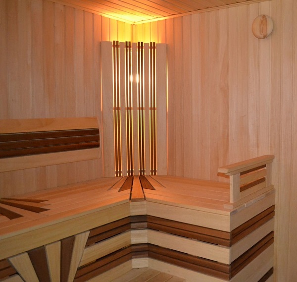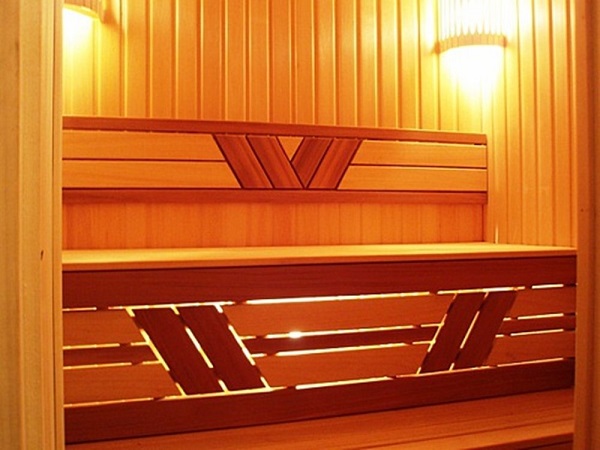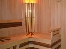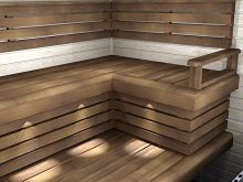 Regale, die aus verschiedenfarbigen Brettern zusammengesetzt sind, werden im Dampfbad sehr originell aussehen.vor allem, wenn die verschiedenen Details des Designs in einem Winkel geschnitten sind. Die resultierende Konstruktion sollte mit warmen Wandlampen über der Rückseite und weißen oder gelben LED-Streifen in den Sitzen ergänzt werden.