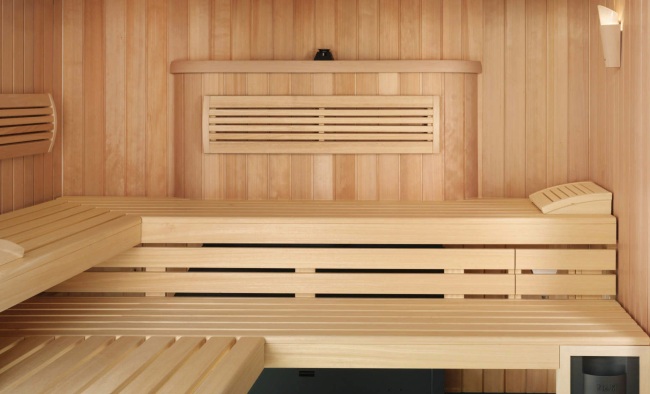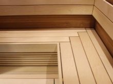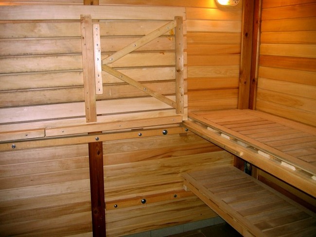 Es ist zu beachten, dass die Regale für die finnische Sauna immer mit einer Dielenrückwand ausgestattet sind. Dieses Detail wird benötigt, damit die Badegäste den Körper nicht an der heißen Wandverkleidung verbrennen.