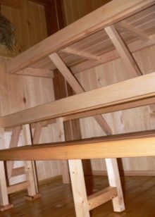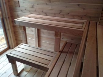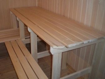 - Zusammenklappbar. Zusammenklappbare Bänke für ein Bad gelten als sehr bequem zu benutzen. In solchen Designs sind die oberen und unteren Regale abnehmbar. Durch diese Struktur werden die Holzelemente des Dampfbades wesentlich einfacher und schneller getrocknet.