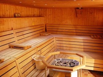 U-förmige "mehrstöckige" Bänke mit einem separaten Rücken, der direkt hinter dem längsten Sitz an der Wand befestigt ist, sehen im Dampfbad gut aus. Diese Designs sehen nicht nur ästhetisch ansprechend aus, sondern sind auch stark und zuverlässig. Sie sind besonders attraktiv im gleichen Ensemble mit hölzernen Becken und Besen.