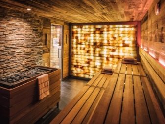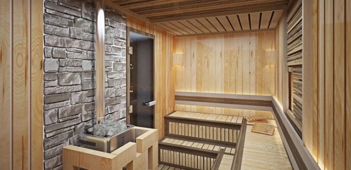 Designer behaupten, dass unter den Bedingungen des Dampfbades keine prächtigen Farbkombinationen sein sollten. Aber die Kombination von Baumarten mit verschiedenen Schattierungen ist eine gute Lösung.