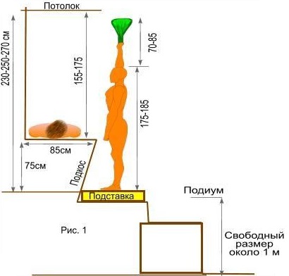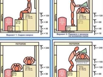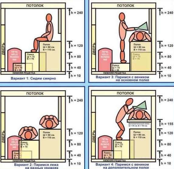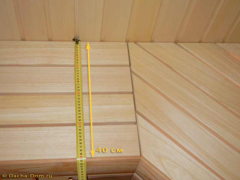 Regale für ein Dampfbad entwerfen, Es ist zu berücksichtigen, dass auf der höchsten Stufe ein Erwachsener frei sitzen und nicht an der Decke ruhen sollte- Dies ist ein weiteres wichtiges Merkmal, das bei der Ausstattung eines Bades nicht zu unterschätzen ist.