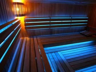 Die Farbe der Hintergrundbeleuchtung kann in diesem Fall beliebig sein: und ruhig blau und fett rot, wodurch das Dampfbad noch heißer oder grün wird. Die Wahl eines geeigneten Diodenbandes hängt von den Vorlieben der Besitzer ab.