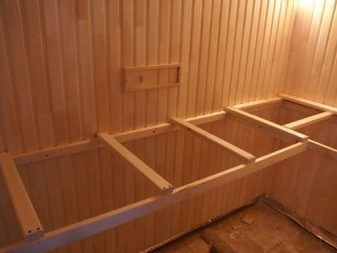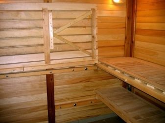 Benutzer, die es vorziehen, unter den Bedingungen von trockenem Dampf zu baden (gemäß der bekannten finnischen Technologie), bauen häufig Strukturen ohne zusätzliche Abstützungen in Form eines an den Trennwänden befestigten Schienenregals.