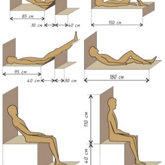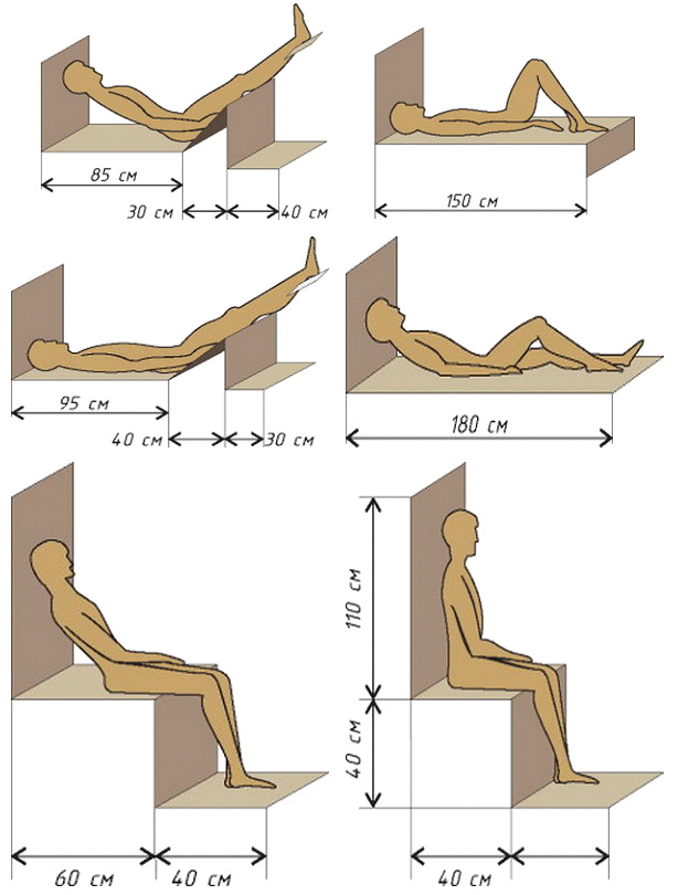 - Um sich (mit gedrückten Beinen) über die Bank zu setzen, benötigen Sie ein 90 cm breites Design, auf dem sich ein Benutzer mit beliebigen physiologischen Parametern aufhalten kann.