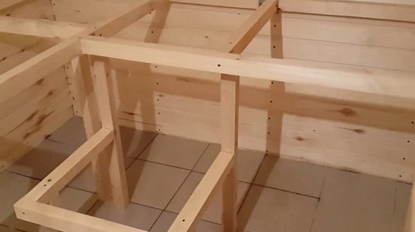 - Der nächste Schritt wird an den Wänden des Tragrahmens befestigt, dessen Länge der Breite der Regale entspricht.In diesem Stadium ist es wichtig, die beiden Holzstäbe auf einer einzigen Höhe zu sichern.