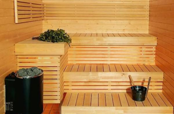 Ihre Gestaltungsmerkmale hängen vor allem von der Raumfläche und ihrer Höhe ab. Dampfregale sind normalerweise entweder entlang einer der Wände oder um zwei Wände angeordnet.parallel zueinander. Es gibt auch Eckentwürfein dem die Anordnung der Ebenen völlig anders ist.