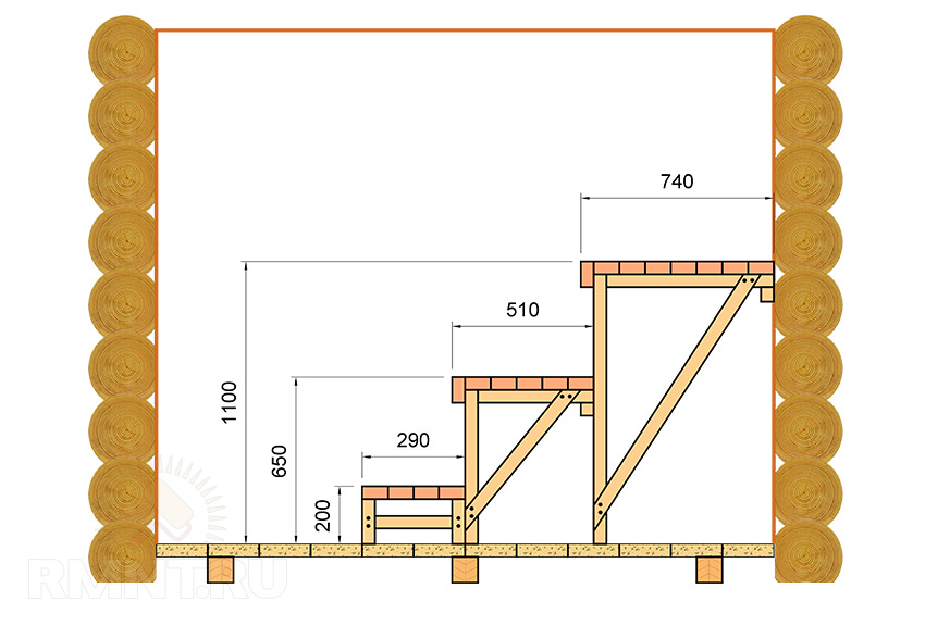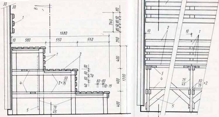 Unten finden Sie eine Anleitung zur Herstellung von Regalen am Beispiel eines Dampfbades mit Abmessungen von 2,5x3 m.