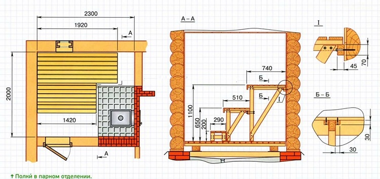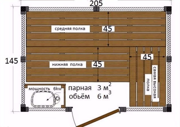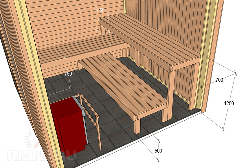 - Zum Beispiel wird es in einem Dampfbad mit den Abmessungen von 2,5x3x2,5 m möglich sein, Bänke nur entlang einer langen Wand anzuordnen. Für den Rahmen des Regiments werden Stangen mit einem Querschnitt von 50x70 cm benötigt