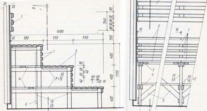 Meistens sind die Regale dreistufig. Natürlich können Sie ein zweistöckiges Möbelstück bauen. Modelle mit einer großen Anzahl von Ebenen sollten nicht entworfen werden - auf ihnen zu sitzen, ohne die Decke zu berühren, wird es fast unmöglich sein, wenn Sie die ganze Arbeit richtig machen.