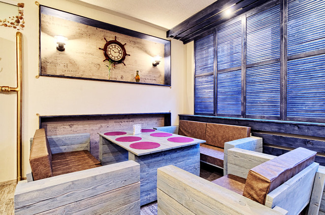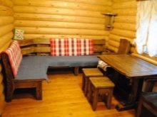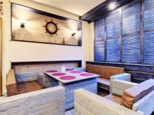 Es ist wichtig, dass die Bänke und Stühle stark und feuchtigkeitsresistent sind.. In Gegenwart von Polstermöbeln und Textilien auf den Möbeln, sollten sie nicht nass werden dürfen, regelmäßig ist es notwendig, sie zu waschen und zu trocknen.Wenn es der Platz erlaubt, können Sie eine kleine Küche mit einem Waschbecken, einer Arbeitsfläche oder einem Wasserkocher einrichten. Die Wände in der Nähe der Spüle können mit Fliesen oder bunten PVC-Platten dekoriert werden. Es wird schön und praktisch werden.