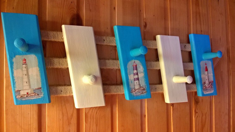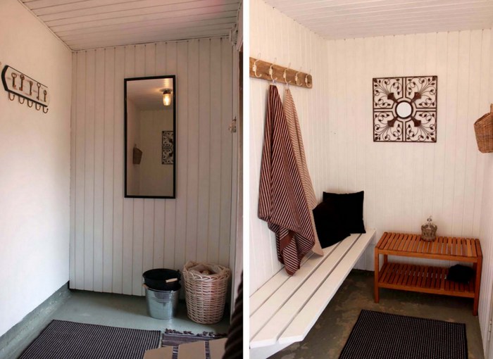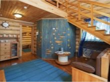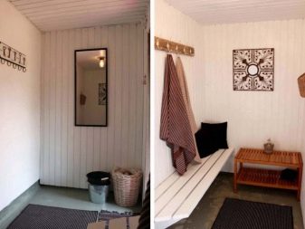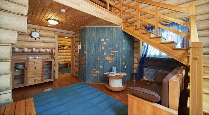Für Romantiker können Sie einen Yacht-Stil empfehlen.. Die Umkleidekabine ist mit Naturholztönen verkleidet, Fenster sind zu stilisierten Bullaugen gestaltet. Blau-weiß karierte Vorhänge, Pelzkissen, Seilschmuck und natürlich ein dekoratives Lenkrad werden dazu beitragen, das maritime Thema zu betonen.