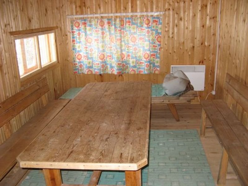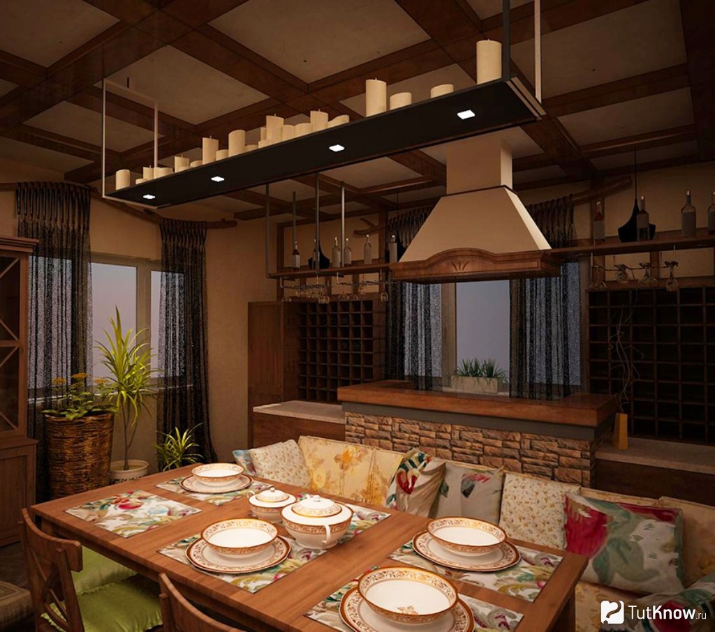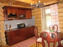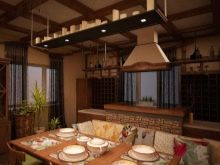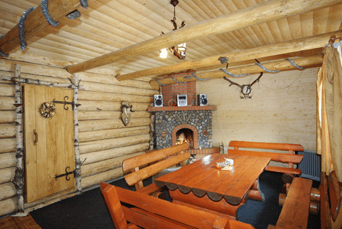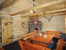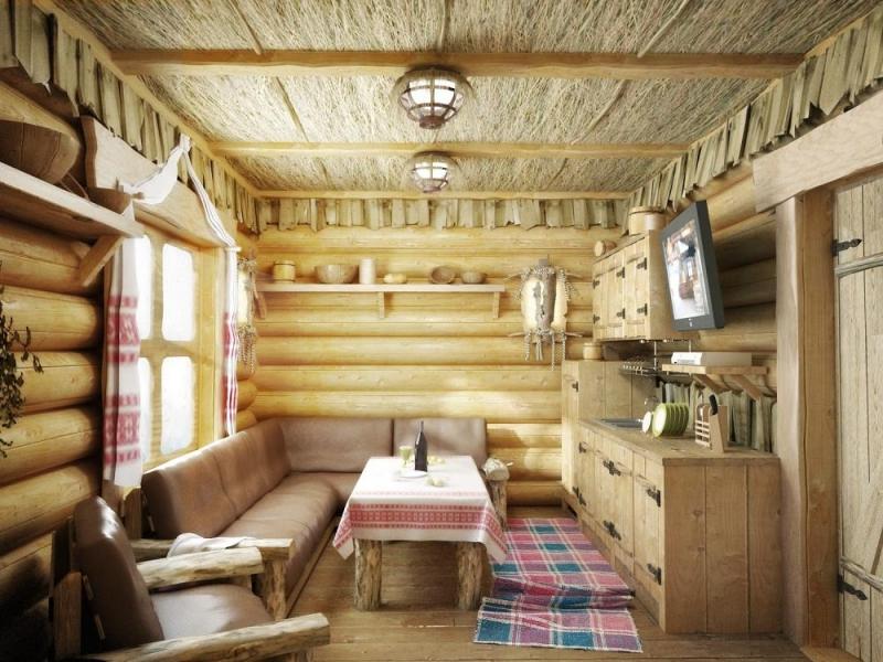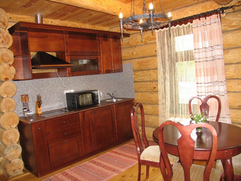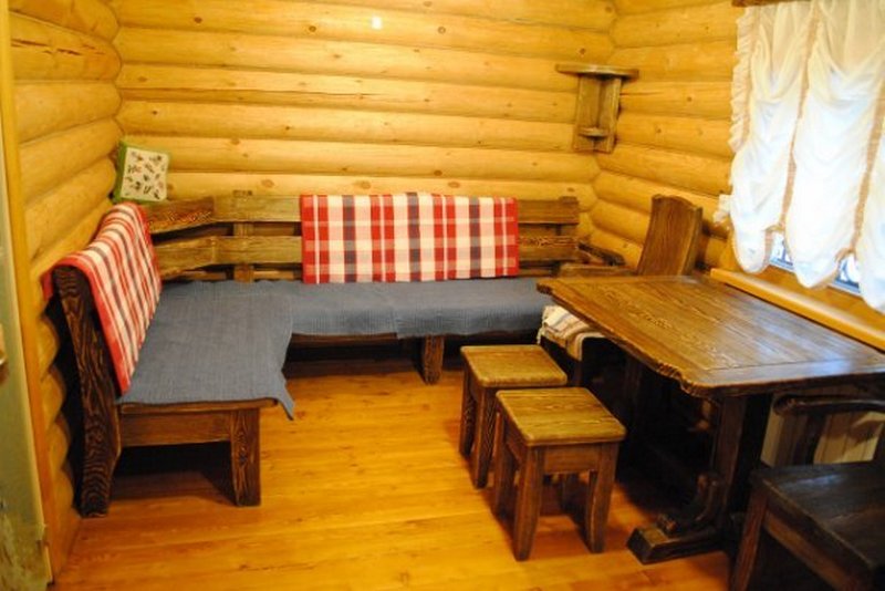Die Mitte des Raumes wird zu einem großen Eichentisch, Stühlen oder Bänken. Glätten Sie einige Rauhigkeiten des Inneren ermöglichen farbige Wege auf dem Boden, bestickte Spitze Tischdecke, ähnliche Vorhänge und Handtücher. Besen und Bündel von getrockneten Kräutern hingen von der Decke, ebenso wie Steingut und ein Samowar auf dem Tisch, der das Innere ergänzt.