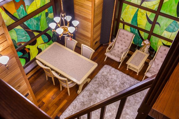 Details: Gemälde an den Wänden, Glasmalerei, die Verwendung von bemalten Fliesen für Gzhel oder Khokhloma werden dazu beitragen, dass der Warteraum originell und stilvoll wird.