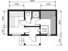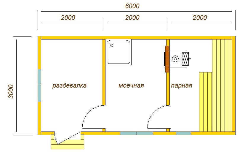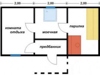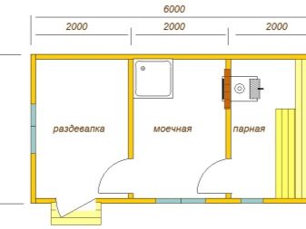 - Projekt 3. Option, bei der alle Räume die gleiche Fläche erhalten. Und sie sind so angeordnet: Umkleideraum, Waschraum, Dampfbad. Das Ankleidezimmer bietet genug Platz, um sich dort auszuruhen und sich umzuziehen.
