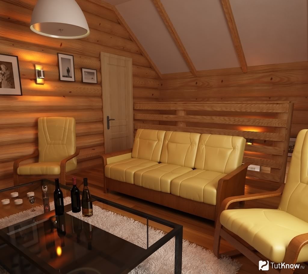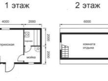 Aber im ersten Stock ist mehr Platz. Sie können ein geräumigeres Dampfbad machen, einen Platz für einen Hauswirtschaftsraum finden und eine Duschkabine im Waschraum installieren. Dann wird der Raum unter dem Dach vollständig für Entspannung ausgelegt sein. Darin können Sie einen Tisch zum Tee trinken, ein gemütliches Sofa stellen und sogar eine Kochecke ausstatten.