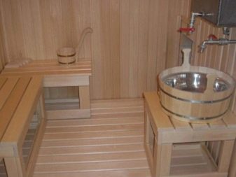 Waschen kann klein gehalten werden. Die Hauptsache ist, dass es einen Platz für einen Container mit Wasser und freier Bewegung im Raum von mindestens zwei Menschen gab. Um Quadratmeter zu sparen, können Sie den Waschraum mit dem Dampfbad verbinden, obwohl Experten, die viel über das Badegeschäft wissen, dies nicht empfehlen..