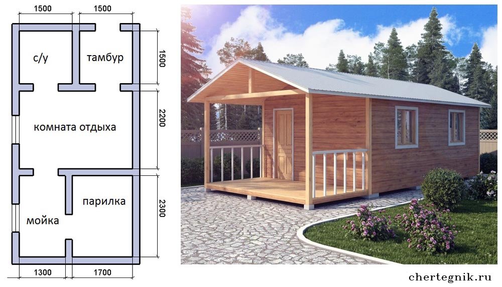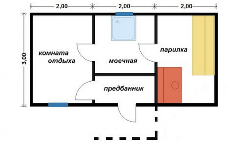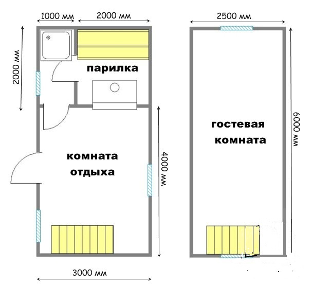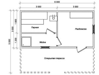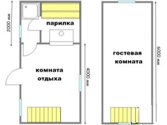 Die Hauptsache ist, zu entscheiden, was vorzuziehen ist und zu welchem Raum mehr Platz und zu welchem weniger Platz.Ein wichtiges ist das geräumige Dampfbad und braucht keinen Ruheraum, der andere, im Gegenteil, benötigt einen Platz, wo Sie Gäste für Tee sammeln können, und das Dampfbad ist auch kompakt. Und der dritte Ruheraum beschließt, die Veranda zu ersetzen.