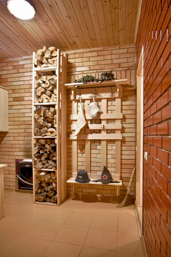 Für die Lagerung der notwendigen Dinge werden Brennholz, Kohle, Badzubehör als Schuppen dienen. Brennholz kann in einer speziellen Box sein. In einigen Fällen werden Holz oder Kohle im Ofen direkt von dem im Haushaltsraum befindlichen Flügel zugeführt.