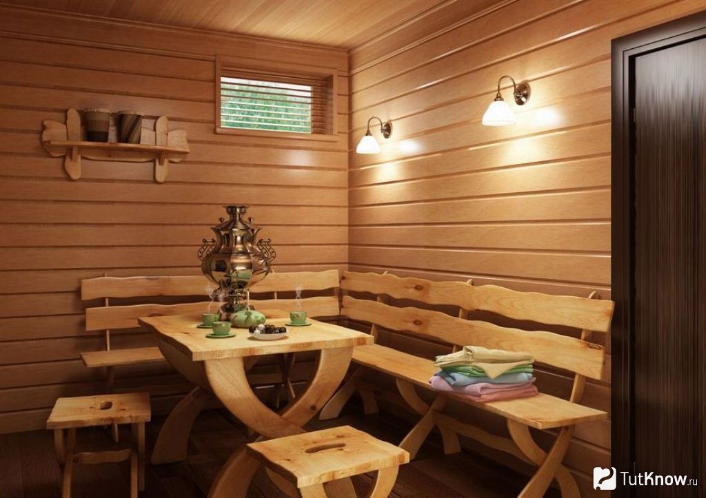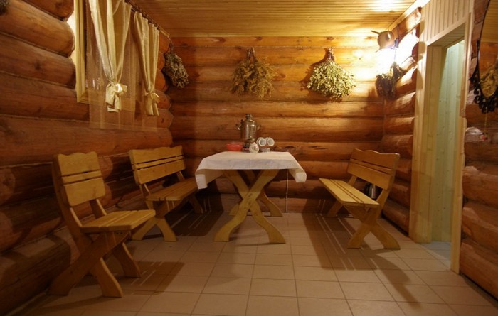 Die Räume, wo Sie einen Platz finden können, und Sie können ohne sie auskommen - ein Ruheraum oder eine kleine Veranda, die es ersetzt. Separate Räume für diese Zwecke sind praktisch, denn dort können Sie sich mit einem kleinen Familienkreis oder mit Gästen nach Badeschritten treffen und bei einer Tasse Tee unterhalten.