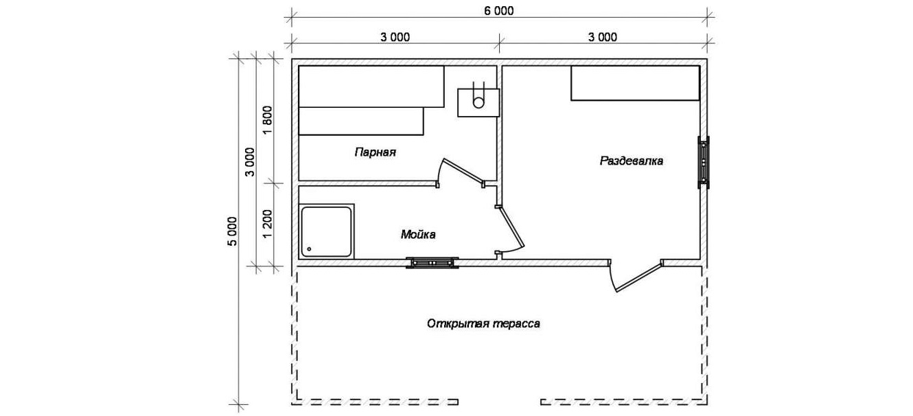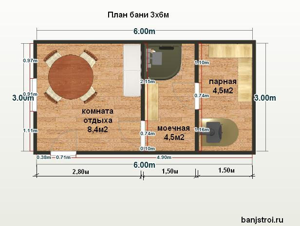 Bevor Sie Materialien kaufen und ein Fundament bauen, müssen Sie sich über das Projekt eines 3x6 m großen Bades Gedanken machen und eine Zeichnung vorbereiten. Es ist nicht schwer, die Räume, die sich in einem Raum von 6 mal 3 Metern befinden, schematisch darzustellen.