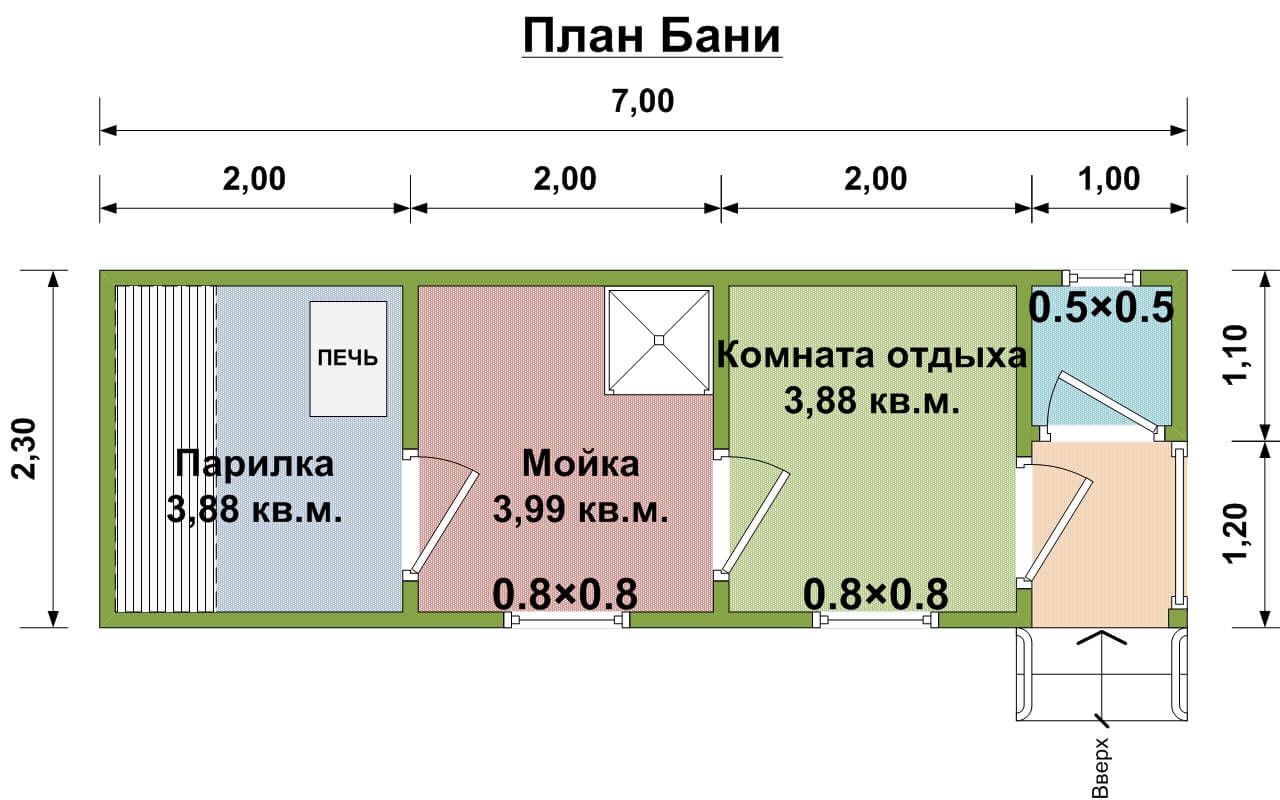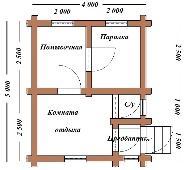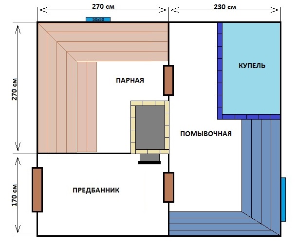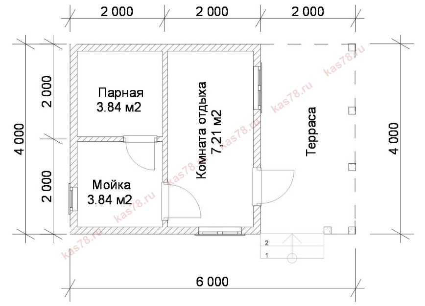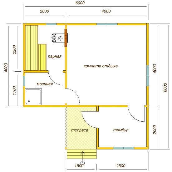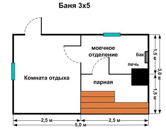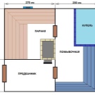 - Dampfbad. Es ist wichtig zu berücksichtigen, dass sich die Tür nach den Brandschutzvorschriften nach außen öffnet. Es wird empfohlen, dass die Höhe vom Boden bis zur Decke im Dampfbad nicht mehr als 2,5 m beträgt, so dass Sie weniger Material, Zeit und Mühe aufwenden müssen, um ein Bad zu bauen und die Räume auf die erforderliche Temperatur zu erhitzen.