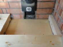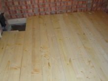 Wenn die Enden der Balken in Kontakt mit den Wänden sind, werden sie mit Dachpappe umwickelt. Dann baue einen Bodenbelag aus unbesäumten Brettern. In der gleichen Phase wird durch das Loch für den Schornstein bestimmt.