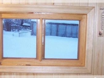 Um die Wärmeisolierung zu verbessern, sollten die Fenster so niedrig wie möglich platziert werden, und im Dampfbad sollten hohe Schwellenwerte eingehalten werden. Es ist wichtig, die Fenster klein zu machen. Je größer die Verglasungsfläche, desto größer der Wärmeverlust. Die Fläche des Fensters im Bad sollte 5% der Bodenfläche nicht überschreiten.Die Rahmen sollten fest an den Bindungen angebracht sein, die Schlitze sorgfältig verstemmt.