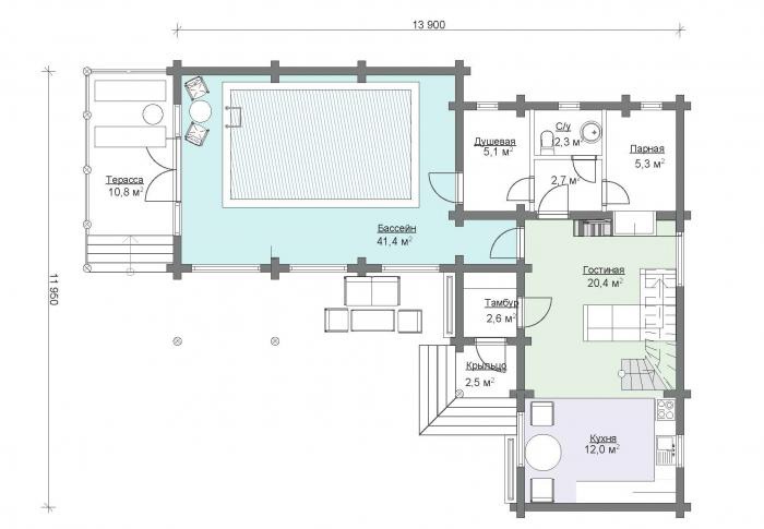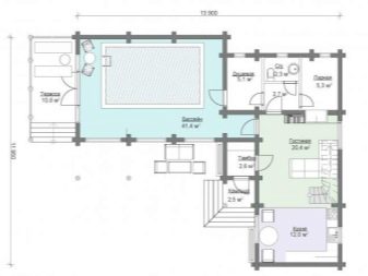 Das Hauptmerkmal der Bäder vom eckigen Typ ist ihre nicht ganz Standardform, die schön und stilvoll aussieht. Eine solche Variante des Gebäudes ist durch die Lage des Dampfbades senkrecht zum Rest des Gebäudes gekennzeichnet.