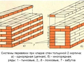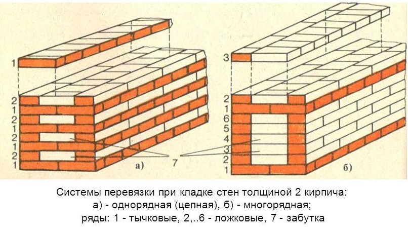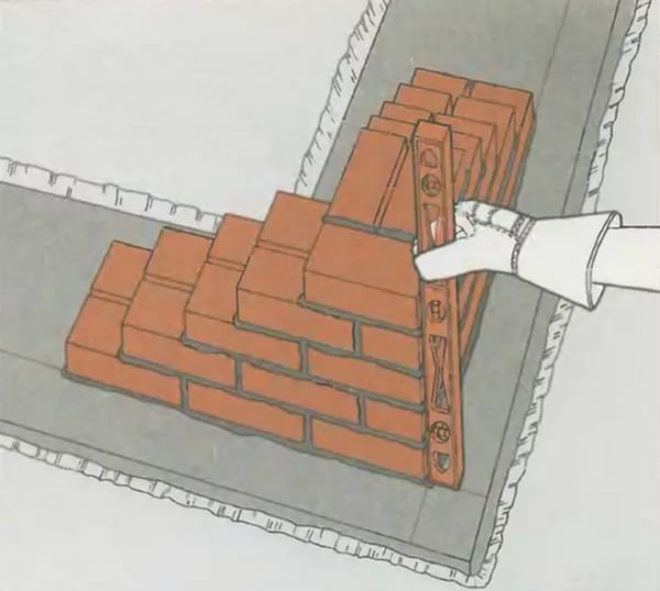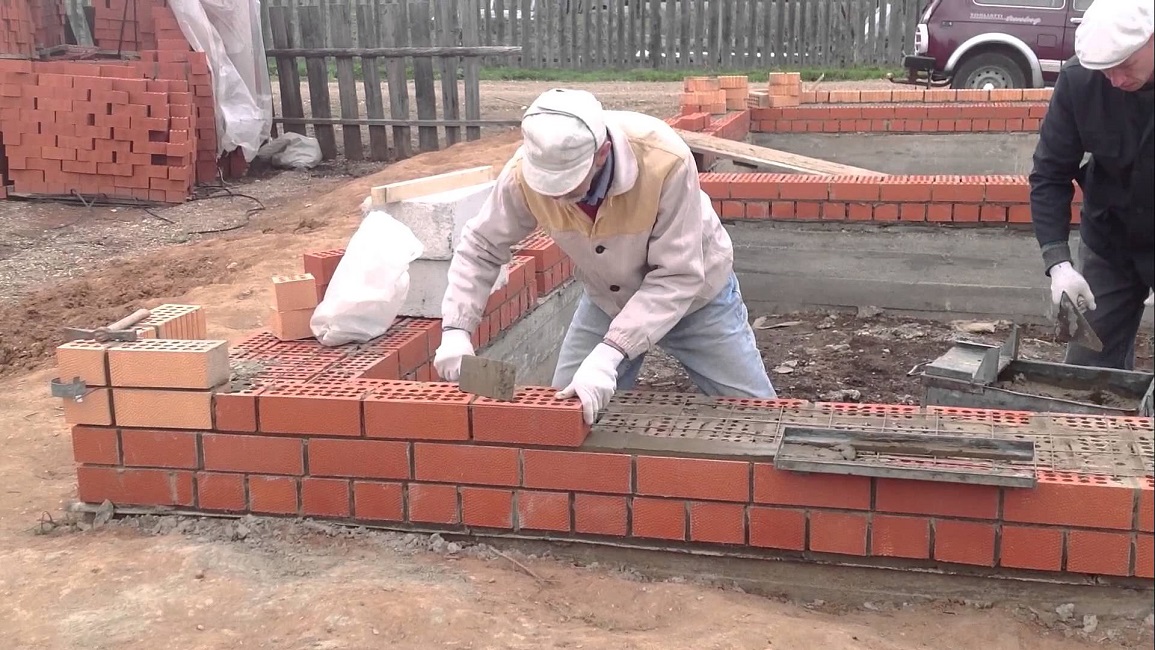 Nach Abschluss der Imprägnierung des Fundaments können Sie mit dem Bau von Wänden fortfahren. Das am häufigsten verwendete Einzelligationssystem, da es einfach zu bedienen ist,es kann leicht alleine gebaut werden. Dieses System besteht aus dem Wechsel von Löffel und verbundenen Reihen von Ziegeln. Eine Löffelreihe ist eine Reihe von Ziegeln, die mit der Seite entlang der Wand gelegt werden, und die Reihe wird mit den Enden zur Außenseite der Wand gelegt.