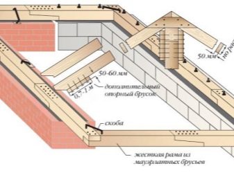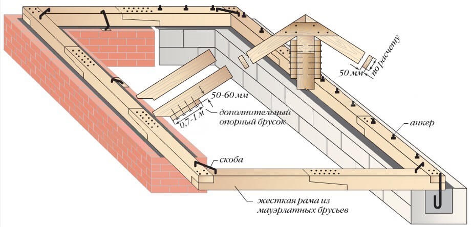 Die Dachkonstruktion kann in einer, zwei oder mehr Rampen hergestellt werden. Es sollte berücksichtigt werden, dass die Installation umso kostenintensiver ist, je komplexer die Dachkonstruktion ist.Von der Wahl des Designs hängt auch der Arbeitsablauf ab. Löcher für Befestigungsstifte sind in den oberen Reihen der Wände gebohrt. Mauerlat und Deckenablagen sind darüber montiert.