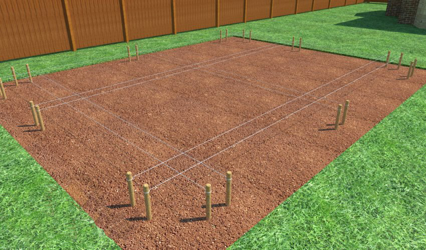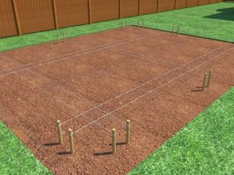 - Markierung der zukünftigen Struktur entsprechend dem Projekt. Heringe sind entlang der Wände und in den Ecken platziert, zwischen denen ein starker Faden gezogen wird;