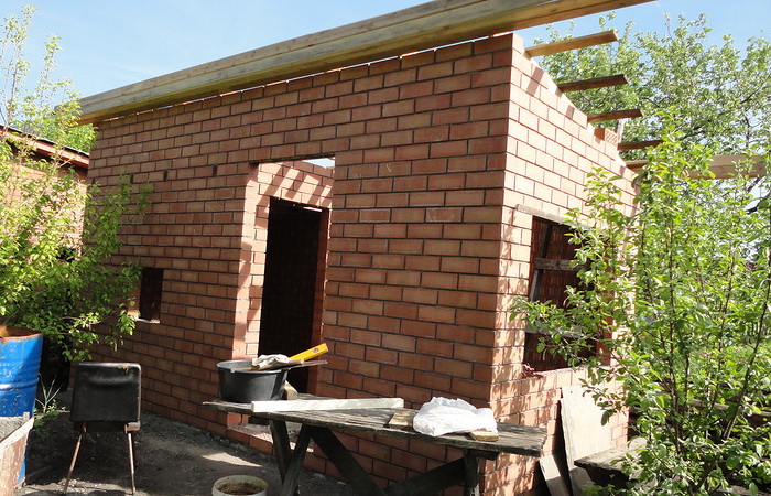 Es wird empfohlen, das Fundament des Bades aus Massiv zu bauen, und die Wände selbst sollten aus Hohlziegeln bestehen. Während der Verlegung müssen Sie alles schnell erledigen, damit der Zementmörtel nicht vorzeitig greift. Bei der Herstellung von Bauarbeiten im Sommer muss der Ziegel zunächst mit Wasser befeuchtet werden. Die Dicke der Zementschicht sollte 2-3 cm betragen.
