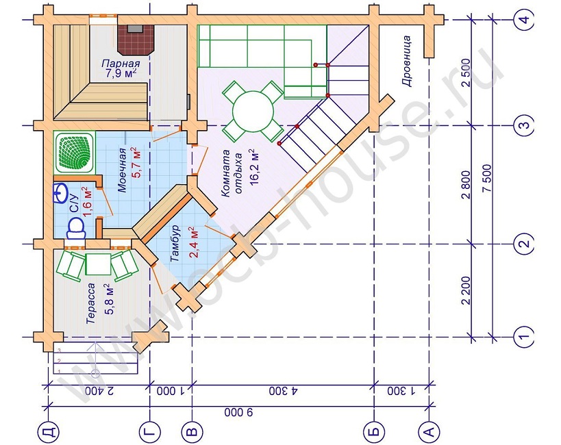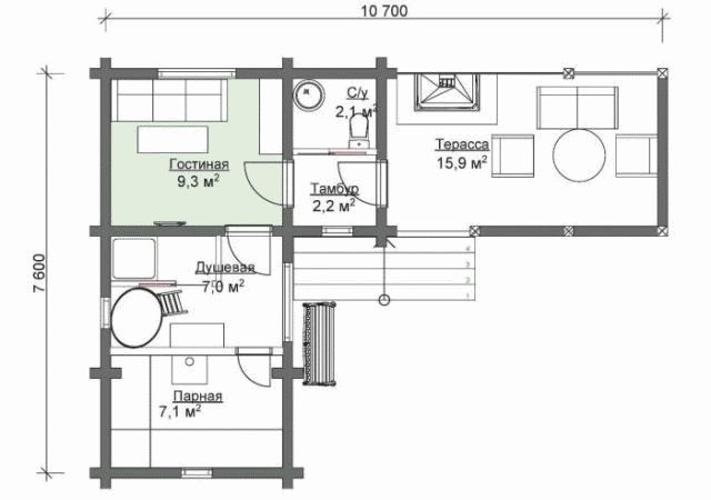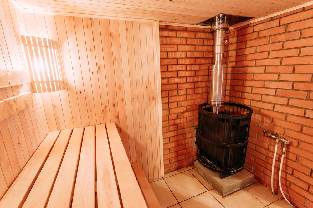 - Der Standort des Kaminofens für ein Dampfbad im zentralen Teil des Gebäudes sorgt für die gleichzeitige Beheizung aller Räume und hilft, den Wärmeverlust zu reduzieren.
