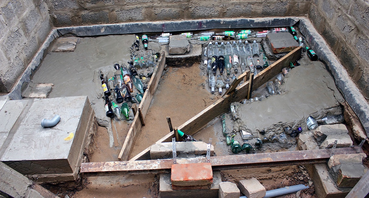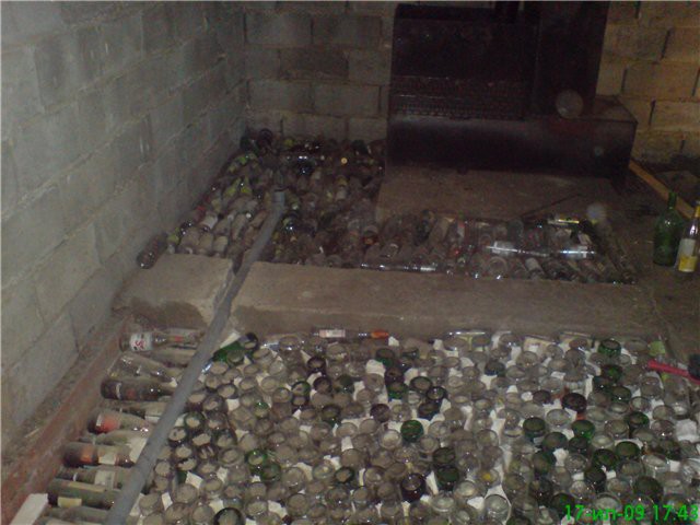 Folk und die preisgünstigste Art, das Baden im Untergrund zu isolieren - verkorkte Flaschen werden in Reihen unter dem geschweißten Netz platziert. Reihen von Flaschen, die mit Sand bedeckt und Wasser verschüttet wurden, gossen dann Zement.