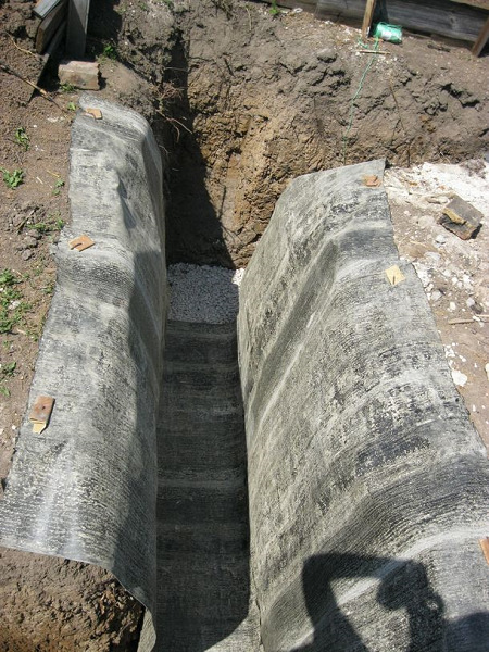 - Auf das resultierende Kissen 1-2 Schichten wasserabweisendes Material geben. Dachmaterial oder Geotextilien werden am häufigsten verwendet;