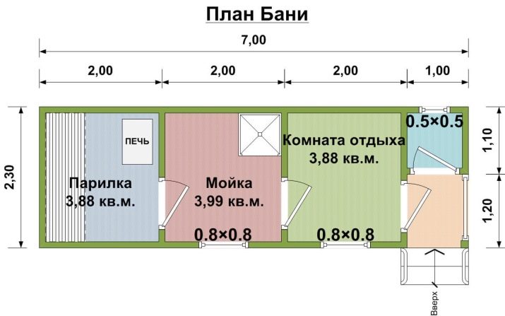 Bevor mit dem Bau des Bades begonnen wird, ist es notwendig, einen Entwurf (Entwurf) der zukünftigen Konstruktion korrekt zu erstellen. Es ist notwendig, alle Merkmale des Gebäudes zu berücksichtigen: das Aussehen, die Anzahl und Größe der Räume, das Schaltschema der Kommunikation, die Gewichtsverteilung der Gebäude, die Berechnung der Menge der benötigten Materialien. Die einfachsten Projekte von kleinen Bädern bestehen aus einem Raum, in dem sich ein Dampfbad, ein Waschraum und ein Ankleidezimmer befinden.