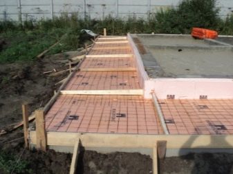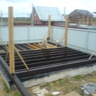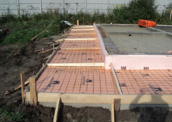 Die Schalung wird wie folgt erstellt: Die obere Kante der Abdichtung dient zum Verlegen von Platten, deren Dicke 50 mm und maximale Breite 1,5 m beträgt Die Verlegung der Platte ist ohne die geringsten Spalten, mit einer Höhe über dem Boden von 30 cm, erforderlich. Drahtverstärkung 50 mm unter der Oberseite der Schalung (später vollständig durch eine Betonschicht verdeckt). Betonieren wird mit einer Mischung aus Zement mit Sand und Kies durchgeführt, in Bezug auf die Dicke ist es vergleichbar mit dichter saurer Sahne. Eine zusätzliche Härtung wird durch Weichmacher erreicht.