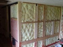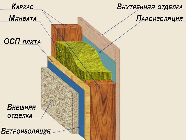 Bei der Arbeit mit Wänden wird die Gesichtsauskleidung in den meisten Fällen auf der Grundlage von Schindeln oder Spanplatten hergestellt. Die Abdichtung erfolgt durch Pergament, das unter die Außenhaut gelegt wird. Nur dann wird der Heizer verwendet, der absolut umweltfreundlich und brandsicher sein soll. Die Gesamtdicke des Kuchens und seiner einzelnen Schichten wird durch die klimatischen Parameter des Gebiets und die Eigenschaften der Verwendung eines Rahmenbades bestimmt.