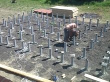 Während des Aufbaus von Bädern auf Schraubenpfählen ist es nicht notwendig, die Stützstrukturen mit Hilfe eines oder mehrerer Kanäle anzudocken. Solche Stützen helfen, selbst auf einem Hügel oder an einem stark erodierten Flussufer mit einem schnellen Fluss zu bauen. Die Einbringung von Pfählen in den Boden erfolgt entweder unter Einbeziehung einer speziellen Ausrüstung oder durch die Bemühungen mehrerer Bauherren gleichzeitig. Bei der Arbeit ist es strengstens unmöglich, die Unterstützung von der Horizontlinie abzuweichen.