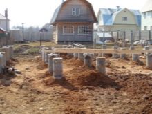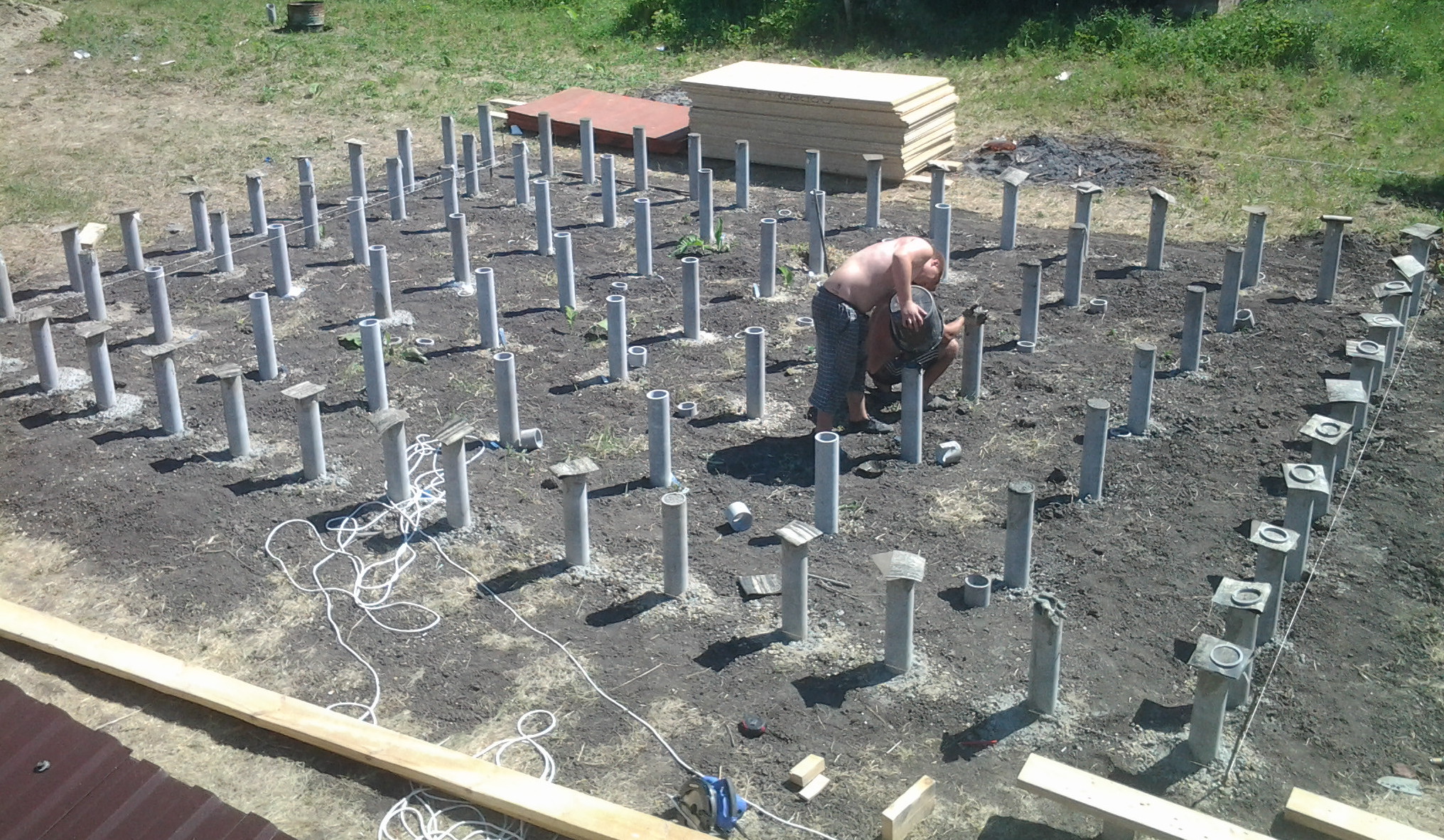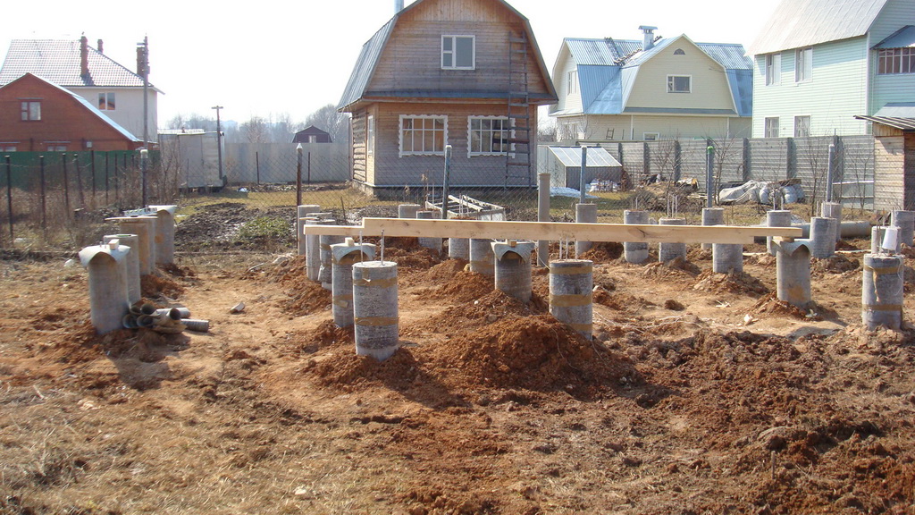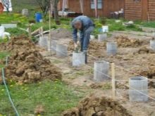 Also, in der Konstruktion der Basis ist es am besten, säulenförmige Strukturen zu verwenden.Sie werden aus Asbestzementrohren mit einem Durchmesser von ca. 10 cm zusammengesetzt und von innen mit Beton gehärtet. Dann markieren sie die Außenkonturen und bohren mit Hilfe eines Bohrers 2 Meter tiefe Bohrlöcher.